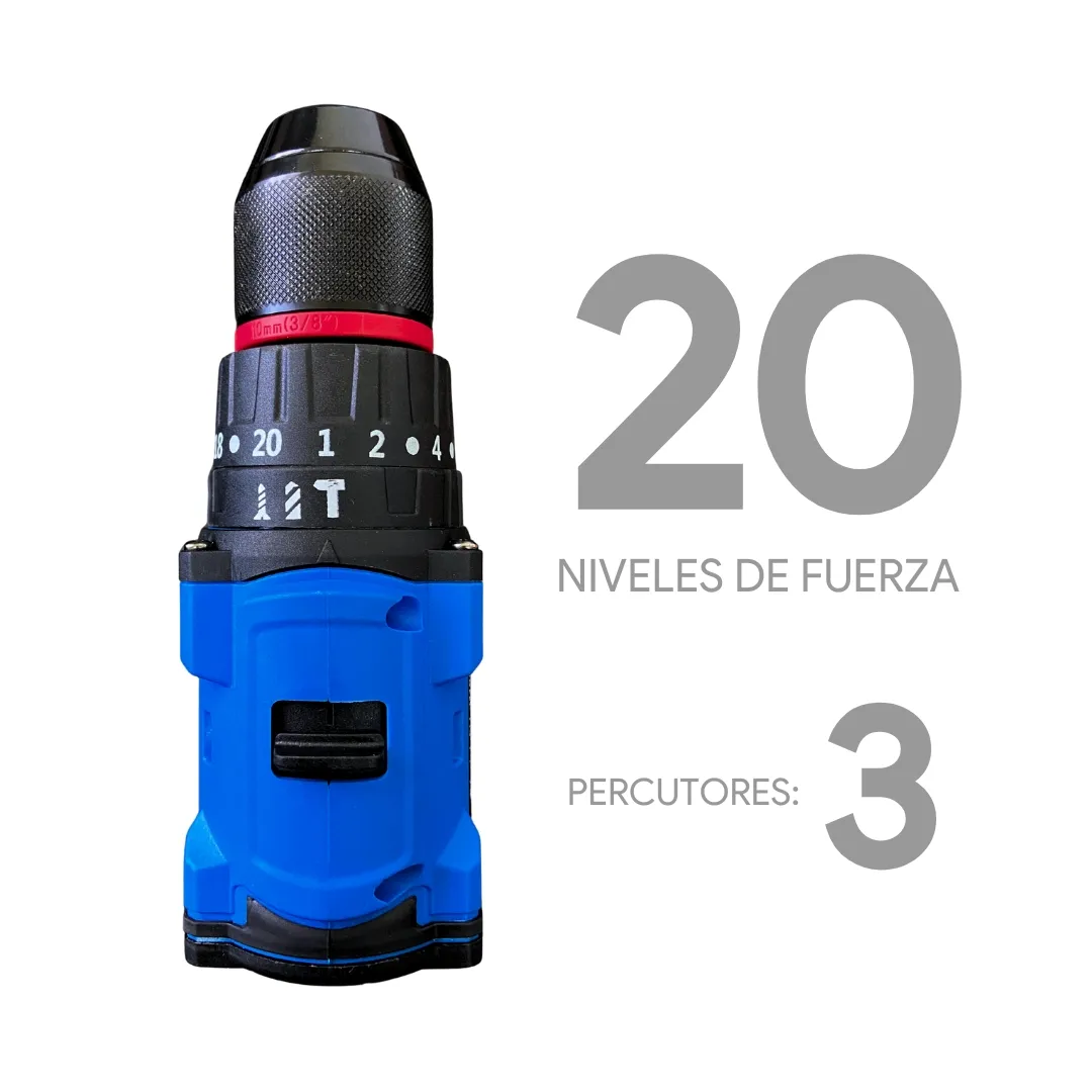 • Ajuste de torque: 20 niveles de fuerza + 3 percutores de perforación/impacto