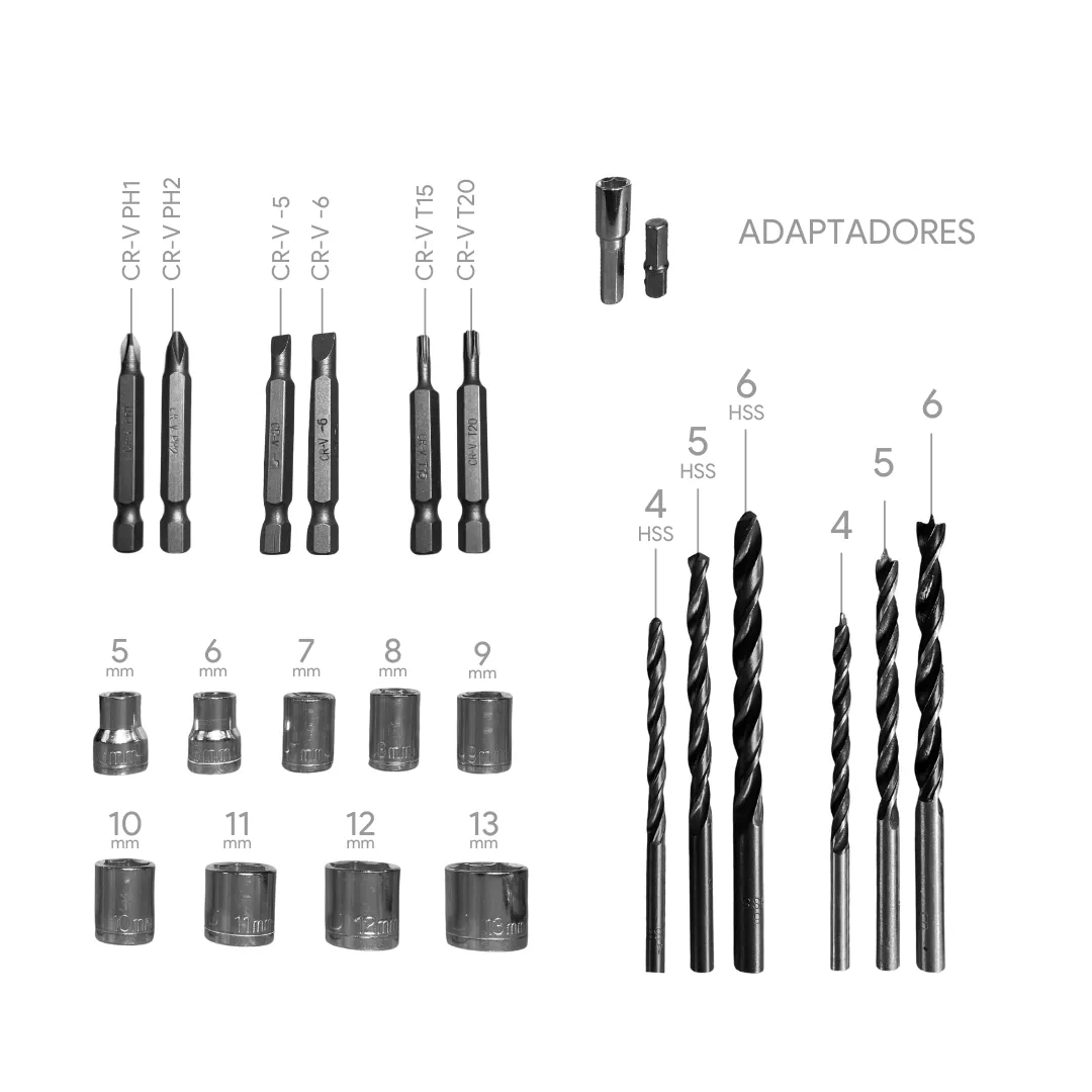 • 3 mechas HSS (4 mm, 5 mm, 6 mm)